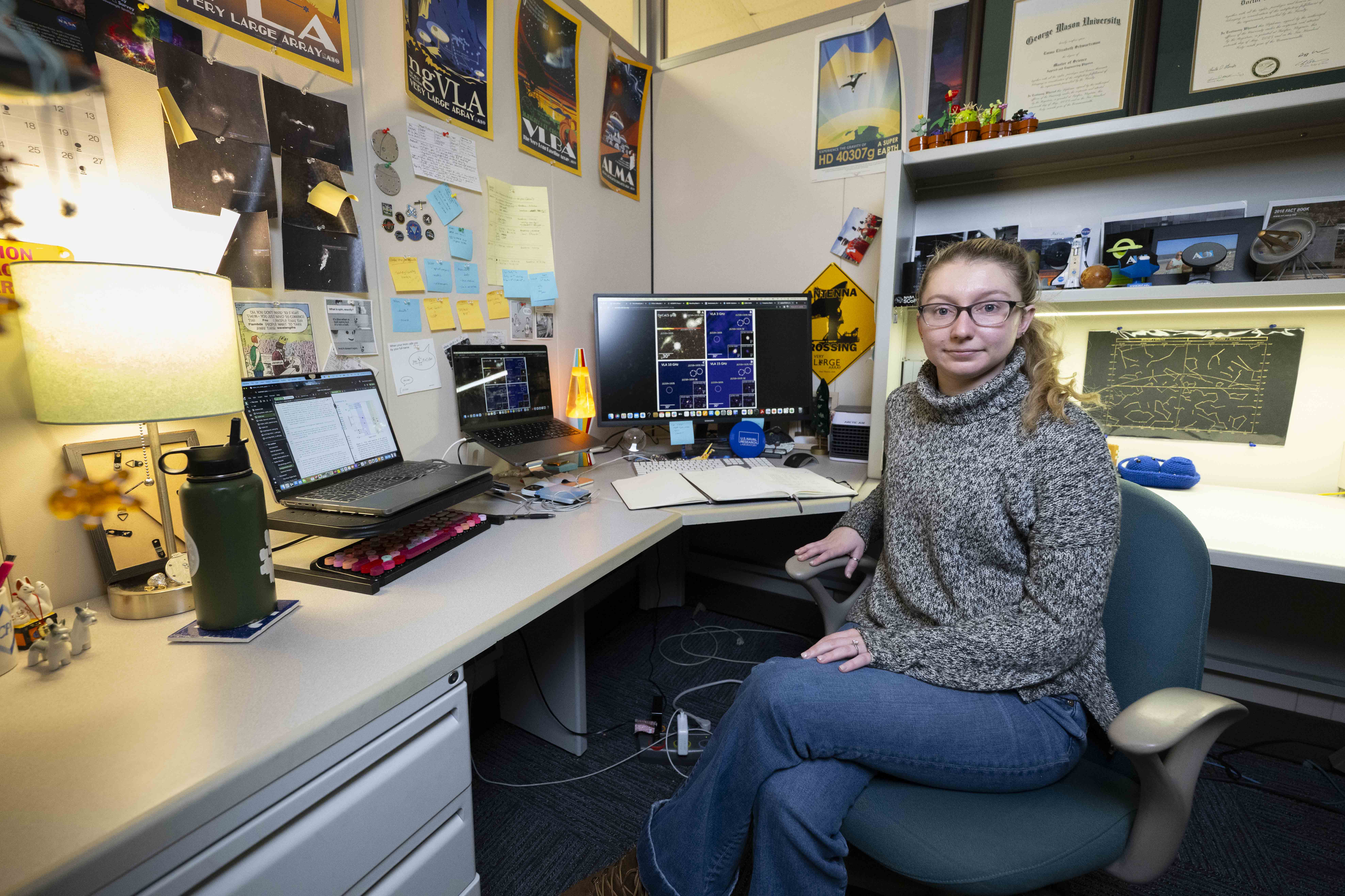 Washington D.C. - Emma Schwartzman, Ph.D., U.S. Naval Research Laboratory astrophysicist, poses for a photo beside her research confirming the first known case of three radio-emitting active galactic nuclei within a single ongoing galaxy merger in Washington, D.C., Dec.15, 2025. The discovery provided new evidence of how supermassive black holes grow and interact during galaxy mergers. (U.S. Navy photo by Sarah Peterson)